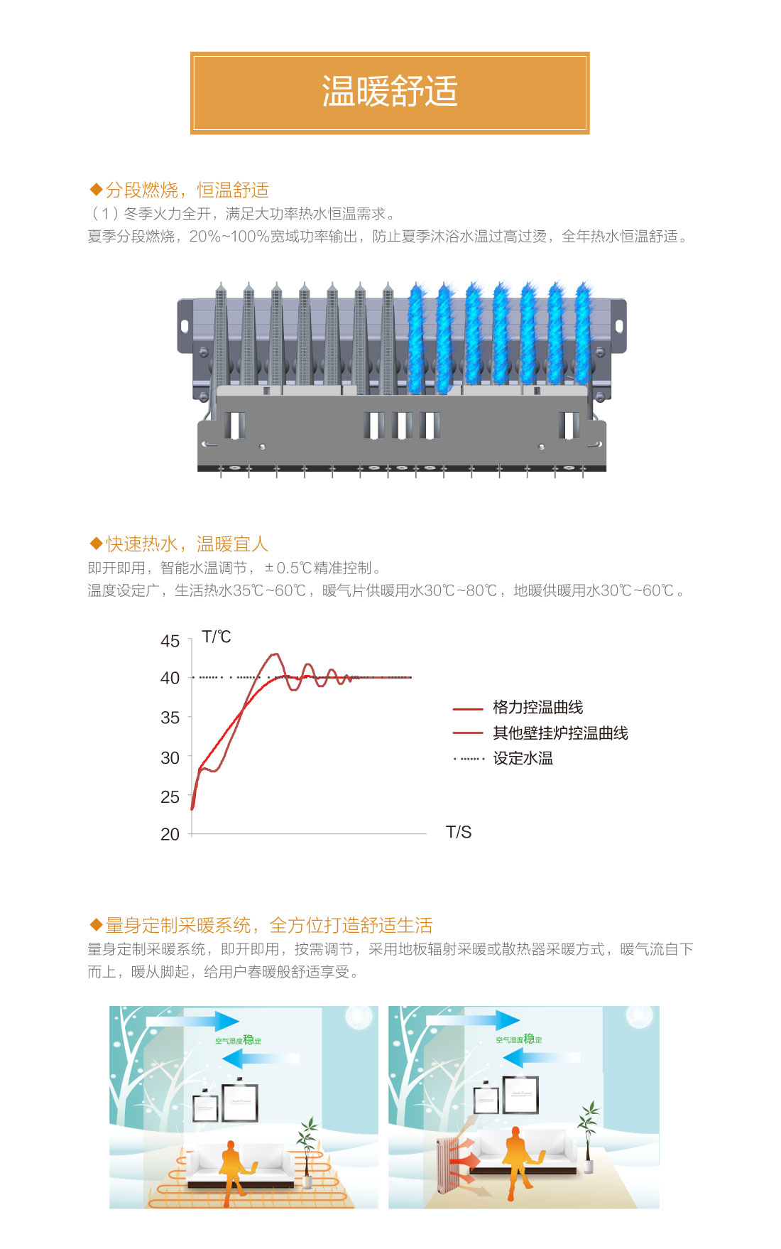 分段燃燒,20%~100%寬域功率輸出,防止夏季水溫過高過燙,智能水溫調(diào)節(jié),±0.5℃精準(zhǔn)控溫,溫度設(shè)定廣,生活熱水35℃~60℃,暖氣片供暖用水30℃~80℃,地暖供暖用水30℃~60℃